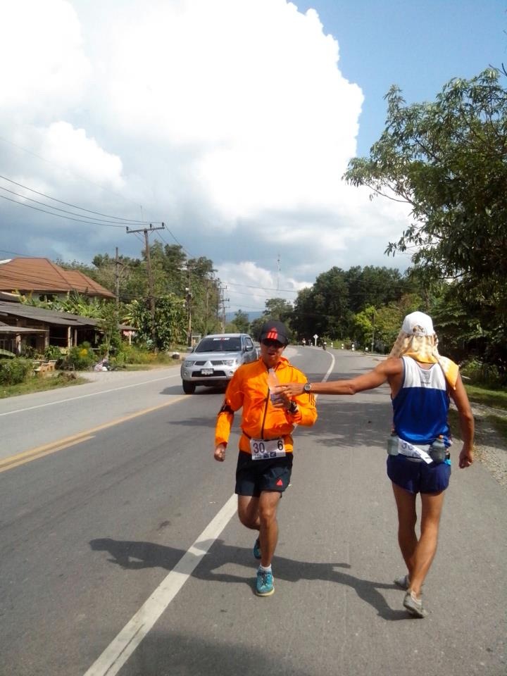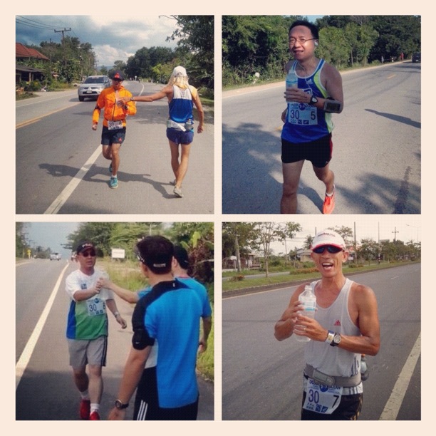 หมอนกทำเวลาได้ดีมาก แซงขึ้นมาประมาณสองทีม ทำให้เราอยู่ในตำแหน่งที่ 13 ที่เบรคแรกหมอนกบอกว่าเหนื่อย วิ่งกันเร็วมาก ของเบรคเร็วหน่อย เราจึงตัดสินใจว่าจะเบรคเร็วขึ้น แต่ขับไปไม่ทันไรก็จึงระยะ 1Km เปลี่ยนผลัดซึ่งเราจะไม่สามารถให้น้ำเกินระยะนี้ได้ เราจึงตัดสินใจจอดที่ระยะ 1Km ให้น้ำหมอนกเป็นครั้งสุดท้ายก่อนที่จะรีบขับไปส่งณัฐลงทะเบียนรอเป็นผลัดต่อไป เราเริ่มจับทางได้แล้ว รถทีมตกลงกันว่าจะจอดในระยะ 2-3Km และให้น้ำเปล่าหรือเกลือแร่ตามแต่นักกีฬาจะร้องขอไว้ก่อนเริ่มวิ่ง เราเริ่มเห็นความตึงเครียดของนักวิ่งแต่ละคนในทีม บรรยากาศในการแข่งขันมีค่อนข้างสูง ดูเหมือนทีมอื่น ๆ จะวิ่งกันเร็วมาก หมอนกจบผลัดแรกที่ความเร็วเฉลี่ย 5:40 นาที นับเป็นเวลาที่ดีมาก เราซื้อน้ำแข็งจำนวนหนึ่งทันที่ที่เราเจอร้านค้า น้ำเย็น ๆ สำหรับนักวิ่ง มันเป็นของที่เข้ากันได้ดีมาก ๆ และเราก็ไม่ผิดหวังณัฐจบผลัดแรกที่ความเร็วมหัศจรรย์ไม่แพ้กัน เรามีลุ้นกันครั้งแรกเมื่อม้าเร็วอย่างตุ๊วิ่งเก็บทีมอื่น ๆ ได้อีก 3-4 ทีมด้วยความเร็วเพียง 5:03 นาที เร็วสุด ๆ ผลัดแรกทุก ๆ คนพยายามกันอย่างสุดความสามารถ เพื่อนร่วมทีมเริ่มรู้หน้าที่ คนยื่นน้ำ ยื่นเกลือแร่ ถ่ายรูป เปลี่ยนชุดสำหรับผลัดต่อไป เก็บขวดน้ำคืน และอื่น ๆ ทีมของเราเรียนรู้กระบวนการอย่างรวดเร็วสมกับเป็นทีมชั้นนำของประเทศ ถ้าวัดกันตาม IQ แล้วอลังการณ์จริง ๆ บรรยากาศเครียด ๆ หายไปอย่างรวดเร็ว ทุก ๆ คนทำหน้าที่ของแต่ละคนอย่างไม่มีที่ติ โดยไม่ได้มีการจัดสรร ตำแหน่งหน้าที่ใด ๆ กันเลยล่วงหน้า แต่ดูเหมือนว่าทุกคนรู้ว่านักวิ่งจะต้องการอะไร และเขาจะทำอะไรให้กับนักวิ่งได้บ้าง ความสนุกค่อย ๆ ก่อตัวขึ้นอย่างช้า ๆ ผลัดที่สอง สาม สี่ที่มีต่อเป็นคนวิ่ง เราก็มั่นใจได้เนื่องจากเป็นนักวิ่งที่มีประสบการณ์สูง ต่อด้วยผลัดที่ห้าอำนวยสมองของทีมทำเวลาเข้ามาเร็วขนาดว่าตัวอำนวยเองยังต้องแปลกใจ โด่งรับไม้ต่อจากอำนวยเพื่อเข้าชิงตำแหน่งอุปกรณ์ดีเด่น ด้วยชุดวิ่งที่หลุดออกมาจากแมกกาซีน มีทั้งหมวก เสื้อ กางเกง color coordination พร้อมกับความเร็วที่พกมาเร็วจนน่าใจหาย จากที่เคยคิดกันว่าวิ่งกันคนละผลัดแต่ละผลัดห่างกันสี่ชั่วโมง ระหว่างรอคงเซ็งน่าดูไม่มีอะไรทำ กลับไม่เป็นเช่นนั้นเลย