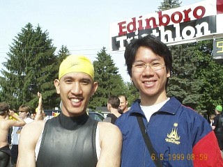 ผมเดินทางไปศึกษาต่อในอเมริกาภายหลังเรียนจบไม่นาน ชีวิตนักกีฬาของผมเริ่มด้วยการโพสหาเพื่อนซ้อมผ่านอินเตอร์เนต แน่นอนว่าผมอยู่ในกลุ่มคนแรก ๆ ที่ใช้ประโยชน์อินเตอเนตในชีวิตประจำวัน ซึ่งรวมไปถึงการหาเพื่อนร่วมซ้อมไตรกีฬานี่ด้วยเช่นกัน ผมได้พบกับเพื่อนนักกฏหมายชาวอเมริกันวัยประมาณห้าสิบหรือย่างห้าสิบผมไม่ค่อยแน่ใจแต่ลูก ๆ เขาอยู่ประมาณ ม.ปลาย เขาพาผมไปปั่นซ้อมใน national park พาไปว่ายน้ำ open water ใน Lake Erie ผมจำได้ว่าผมมีคู่หูซ้อมว่ายน้ำเป็นเพื่อนนักเรียนชาวมาเลเซีย ซึ่งเราก็ออกไปว่าย open water ด้วยกัน ผมยังจำหน้าตาของคนตกปลาที่มองผมเป็นตัวประหลาดที่โผล่มาจากที่ไหนไม่รู้ ราวกับว่าผมว่ายข้ามมาจาก Canada เพราะทะเลสาบที่ผมไปว่ายนั้นเชื่อมติดกับ Canada นั่นเอง จำความตื่นเต้นระทึกใจเมื่อต้องรอเพื่อนชาวมาเลเซียที่ว่ายน้ำไม่แข็งนัก ไม่ยอมโผล่มาจากน้ำเสียที จนผมกลัวจะต้องเป็นคนโทรไปบอกแม่เขาว่าผมเป็นคนสุดท้ายที่เห็นเขา และเพื่อนนักกฏหมายคนนี้เองที่พาผมเข้าไปรู้จักบรรยากาศของการแข่งขันไตรกีฬาแบบที่ควรจะเป็นในรายการแรกของฤดู เป็นรายการชิงแชมป์ของพื้นที่บริเวณนั้น เราขับรถจาก Cleveland, Ohio ไปแข่งกันที่ Edinboro, Pennsilvania ผมเปิดซิง Wetsuit QR ของผมเป็นครั้งแรก เดือน พค. แม้ว่าอากาศจะไม่หนาวแล้วแต่น้ำยังอยู่ประมาณ 10-15C ซึ่งทำให้หัวชาได้เลยีเดียว งานแข่งในอเมริกามีบ่อยมาก ในพื้นที่ใกล้เคียงระดับขับรถไม่เกินสองชั่วโมง (ไม่ต้องไปค้างคืน) มีให้แข่งแทบทุกสัปดาห์ไปจนถึงปลาย ฤดูกาลคือเดือนสิงหาคม