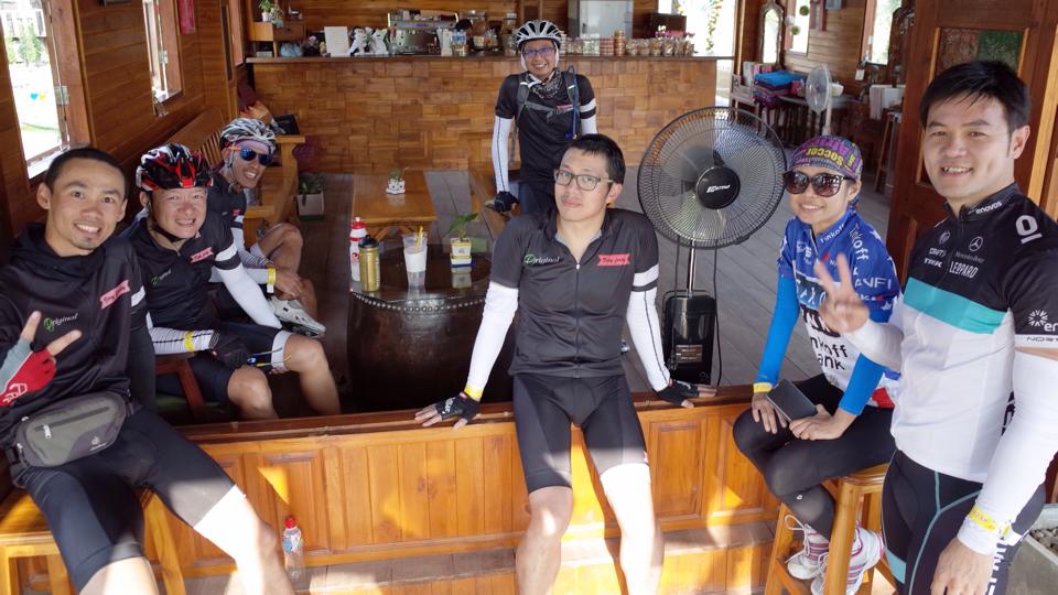 เราเข้าจุดพักทานอาหารกลางวัน ณ เวลาที่กลุ่มนำจะเริ่มออกตัวสำหรับภาคบ่ายพอดี อาหารที่เตรียมไว้สำหรับงานประเพณี เหลือไม่พอถึงทีมเรา นั่นเป็นคำบอกเล่าของดร.ตุ๊ที่เข้าถึงจุดก่อนเราสี่คนพักใหญ่ เราจึงเลือกออกมาทานร้านข้าวแกงริมทางแล้วปล่อยเวลาทริปนี้ให้กลายเป็นทริปของทีมเราไปโดยสมัครใจ ผมไม่ได้ซื้อข้าวแกงมาทานเหมือนคนอื่น เนื่องจากกูเม่ท์แซนวิชที่จ๊อบเตรียมมาให้ตั้งแต่เช้ายังเหลือเป็นจำนวนมาก ผมจึงจัดไปสองชุดเศษ อิ่มเต็มที่ ตบด้วยน้ำมะพร้าว electrolyte drink ที่กำลังเป็นที่นิยมในวงการกีฬาคนอึด ผู้จัดการทีมเราทันสมัยเสียจริง ๆ เมื่อทุกคนอิ่มแปร้ เข้าห้องน้ำห้องท่ากันไปแล้ว การวางแผนปั่นเฟสบ่ายจึงเริ่มขึ้นด้วยจุดพักเบรคที่ร้านกาแฟน่ารัก ๆ ที่ผู้จัดการแนะนำ เราออกปั่นไปด้วยพลังงานเต็มกระเพาะ เราจึงมีช่วงดูดขบวนรถด่วนที่วิ่งผ่านมาเป็นพัก ๆ มีทีมแตกบ้างเล็ก ๆ น้อย ๆ แบบไม่ต้องกังวล เพราะเหลือแต่ขาแรง ประสบการณ์สูง และที่สำคัญอย่างน้อย ๆ เราจะมีกันสองคนเพื่อคอยช่วยเหลือกัน ยกเว้นในช่วงเดียวที่จ๊อบหลุดลงไปเนื่องจากติดทีมอื่น นอกนั้นถ้าแตกก็แตกเป็นสองสอง ซึ่งใช้เวลาไม่นานมากนักก็กลับมารวมทีมสี่คนได้อีก ส่วน ดร.ตุ๊รายนั้นยังนิยมปั่นเดี่ยวอยู่ ก่อนถึงพักเบรคกาแฟ ก็มีเหตุการณ์เปลี่ยนยางเล็กน้อยพอได้มีประสบการณ์สนุก ๆ อำนวยยางระเบิดแล้วเราก็ลงเปลี่ยนยางด้วยกันทั้งสี่คนก่อนเข้าพักเบรคเพียงไม่ถึงหนึ่งกิโล