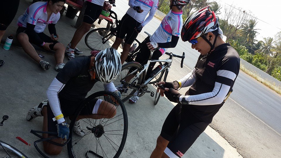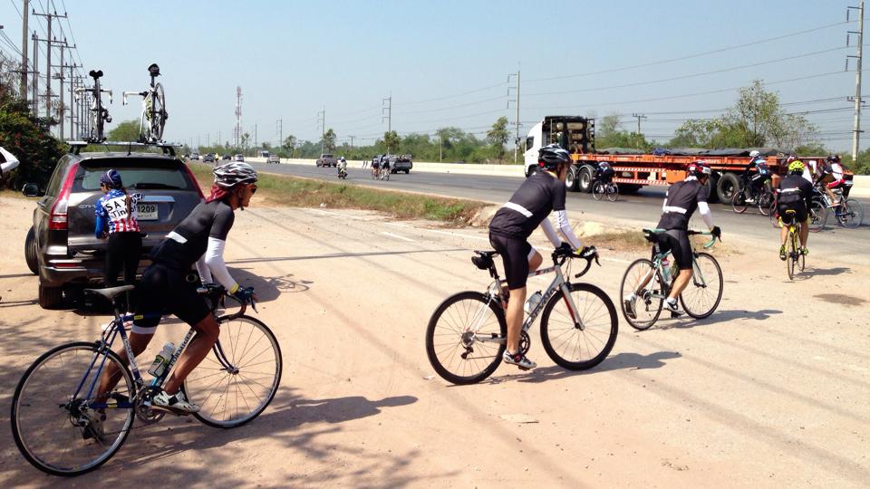 ในที่สุดผมกับจ๊อบจึงตัดสินใจเข้าข้างทางเพื่อรอ เพราะปั่นไปเช่นนี้อาจจะไม่มีวันได้เจอกัน หลังจอดได้ไม่นานผมก็เจอตุ๊ปั่นผ่านไป เขาไม่เห็นพวกผม และผมเองก็ไม่คิดว่าจะเจอตุ๊อีกครั้งเพราะเขาทิ้งเราไปล่วงหน้านานมากแล้ว สงสัยว่า ดร.ตุ๊แอบเข้าปลดทุกข์ที่ปั้มใดปั้มหนึ่ง ผมโทรศัพท์หาผู้จัดการทีม ก็พบว่าเพื่อนร่วมทีมเริ่มหมดสภาพ และกำลังช่วยเหลือกันอยู่ น้องแววดาวผู้ไม่เคยปั่นเกิน 50km ขอยอมแพ้ที่ระยะประมาณ 100km มีจอนปั่นเป็นพี่เลี้ยงให้ตลอดระยะ 30km สุดท้าย ส่วนโด่งที่ไม่เคยปั่นเกิน 60km ก็เริ่มหมดสภาพ อำนวยปั่นเป็นพื่เลี้ยงเพื่อมาพบกับรถสนับสนุน ผมจึงรอให้นักปั่นทั้งสี่จัดการตัวเองให้เรียบร้อย สองคันขึ้นรถ และอีกสองคันปั่นมาเจอกับเราที่ข้างทางแล้วเริ่มออกเดินทางไปด้วยกันอีกครั้ง ประสบการณ์ของทีมเริ่มสูงขึ้นและจำนวน 4 คันเป็นตัวเลขที่บริหารค่อนข้างง่าย รวมไปถึงเส้นทางที่เริ่มออกนอกเมืองแล้ว การปั่นไม่น่ากลัวเหมือนช่วงแรก เราสามารถที่จะคุยกันดูแลกัน และกำหนด pace ที่เหมาะสมได้ง่ายขึ้น ความสนุกของการปั่นทีมได้เริ่มขึ้นแล้ว หลังจากเราปั่นออกจากกรุงเทพมาร่วม 100 km