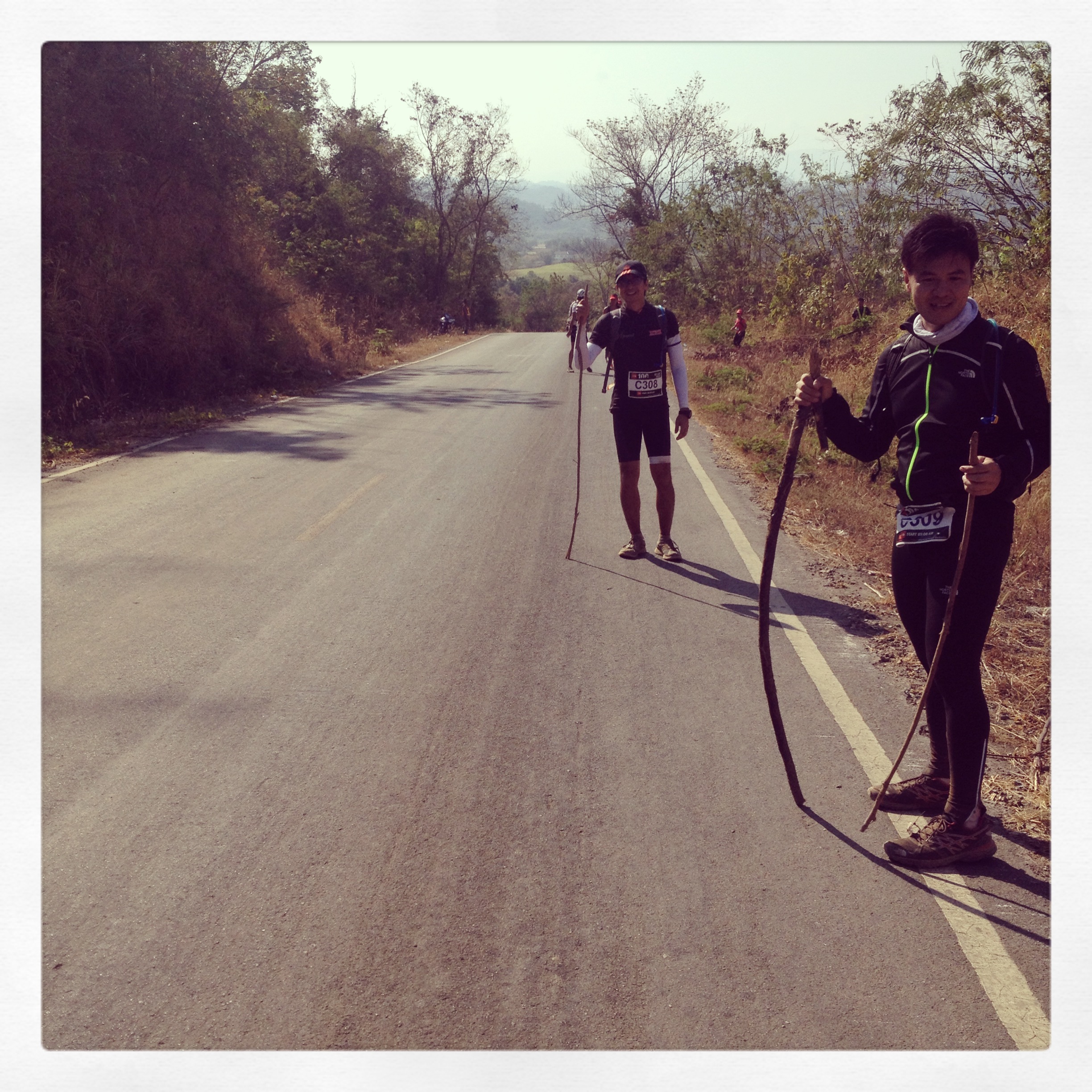 หมอนกหลังจากที่ใช้เวลาเดินกับเรามาร่วมชั่วโมง เมื่อฟ้าเริ่มเปิด เส้นทางเริ่มกว้าง เราก็เห็นหลังหมอนกเป็นครั้งสุดท้าย มันช่างเป็นภาพที่คุ้นตาสำหรับผม ในทุก ๆ คราวที่ผมมีปัญหาบาดเจ็บ ไม่สามารถบังคับร่างกายได้อย่างที่หวัง ก็มีเพื่อนคนนี้แหละที่วิ่งนำแบกเอาความฝันของผมไปให้ ภาพเจนตานี้ค่อยห่างไปทีละก้าวละก้าว ผมรู้แน่ว่าวันนี้จะมีใครบางคนในทีมของเราที่ไม่ “โด่ง” อย่างแน่นอน ส่วนที่เหลือนะเหรอ ไม่มีใครทำท่ากระดิก ไม่มีใครบอกลา และไม่มีใครตาละห้อย ราวกับว่ารู้ชะตากรรมของตัวเอง และฝากวิญญาณของเขาไปกับร่างเล็ก ๆ ร่างนั้นไปเรียบร้อยแล้ว ถึงเวลานี้แต่ละคนเริ่มหยิบคว้าเอาท่อนไม้มาทำไม้เท้ากันแล้วค่อย ๆ เดินกันต่อไป ต่างก็เปรย ๆ กันว่ามีไม้นี่มันช่วยได้เยอะเลยนะเนี่ย ส่วนผมเองหาไม้ที่ถูกใจไม่ได้เสียที จนกระทั่งตุ๊ยกไม้ของเขามาให้ผม มันเข้ามือผมอย่างมาก และผมไม่เคยคิดมาก่อนว่ามันจะอยู่ร่วมกับผมจนกระทั่งเข้าเส้นชัยในวันนั้น