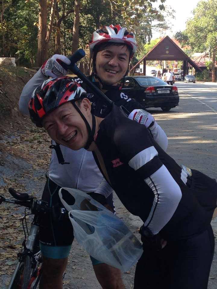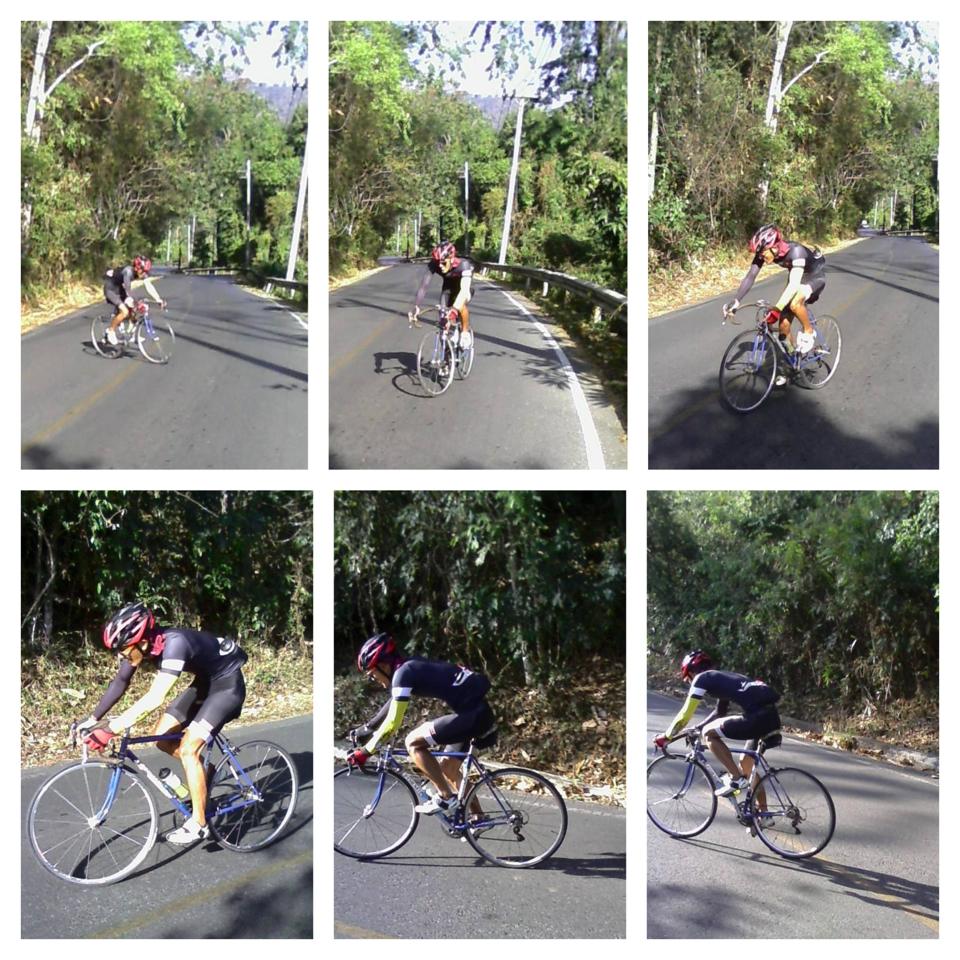 ผมหันไปด้านหลังเพื่อสังเกตุอาการของตุ๊ซึ่งก็บ่นว่าเกียร์หมดแล้วเช่นกัน จริง ๆ แล้วผมค่อนข้างดีใจที่ตุ๊บ่นเช่นนั้น เนื่องจากรูปร่างของเขานั้น สังเกตุจากขนาดของต้นขา การปั่นเขาน่าจะเป็นจุดอ่อนของตุ๊ได้เลยทีเดียว ต้นขาขนาดมหึมาไม่ต่างจากสปรินเตอร์ หรือ นักปั่น track มีศักยภาพในการระเบิดพลังขา กดวัตต์ประมาณมหาศาลออกมาในช่วงสั้น ๆ การปีนเขานั้นเป็นเรื่องของความสามารถในการผลิตพลังงานเป็นวัตต์ต่อกิโลกรัมออกมาในประมาณพอสมควร แต่ที่สำคัญกว่าคือ cardiovascular efficiency ที่จะแลกออกซิเจนออกจากกล้ามเนื้อได้มากกว่า เร็วกว่า จะการก่อตัวของกรดแลกติกในกล้ามเนื้อเกิดขึ้นช้ากว่า หรือไม่เกิดขึ้นในระหว่างการปีนเขานั้น ๆ ดังนั้นเมื่อตุ๊เลือกที่จะใช้เกียร์ต่ำ ๆ จนถึงเกียร์สุดท้ายผมมั่นใจว่าเขาไม่ได้ใช้กล้ามเนื้อผิดประเภทเข้าไปห้ำหั่นกับเขาลูกนี้ แต่อย่างไรก็ตามทักษะการปีนเขานอกเหนือจากการเปลี่ยนเกียร์และใช้ขานั้น มันก็ต้องมีการสั่งสมมาประมาณหนึ่ง การปีนเขาครั้งแรกของ ดร.ตุ๊ ไม่น่าจะเป็นเรื่องง่ายสำหรับเขานัก